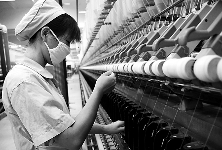 3月26日,位于鄧州市產(chǎn)業(yè)集聚區(qū)內(nèi)的永泰棉紡股份有限公司員工正在趕制訂單產(chǎn)品?! ∈⒅緡?guó) 攝