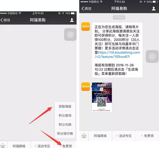 首先點(diǎn)擊右小角的免費(fèi)領(lǐng),然后點(diǎn)擊分享海報(bào),分享給好友關(guān)注阿福易購的微信公號就可獲得積分。一個好友一百個積分,20個好友就可獲得2千個積分就能兌換馬戲門票。