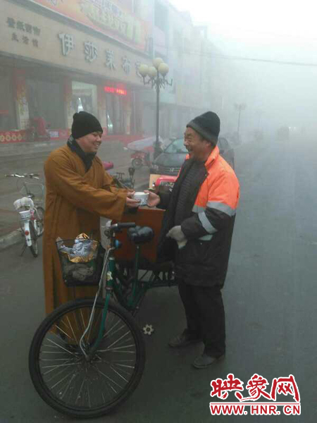 僧人名叫釋妙亮,是滎陽市豫龍鎮(zhèn)興國寺法師。他說,早上6天他們出發(fā)了,截止早上7時30分,他們已經免費送了三桶臘八粥。