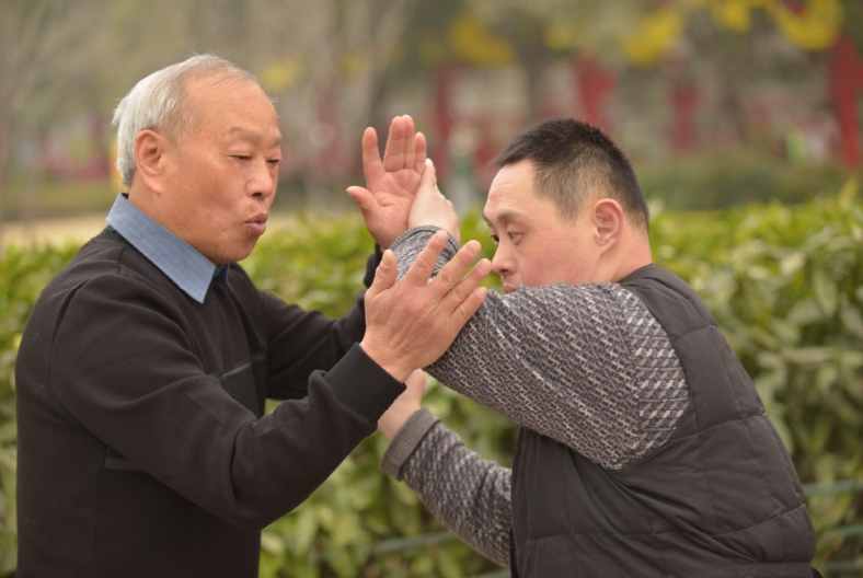 談起和周遠的結緣,聶玉璽如數(shù)家珍。4年前,聶玉璽在鄭州人民公園練拳。一個小伙子站在旁邊目不轉睛地看。經過了解,聶玉璽得知,周遠,38歲,因小時候有病,反應遲鈍,有自閉傾向,不愛與人交流,很少有人愿意教他。周遠的父母說起兒子就掉淚。