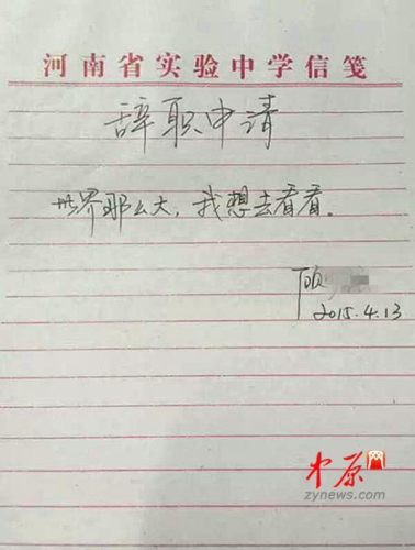 “世界那么大,我想去看看?!苯衲?月,鄭州的中學女老師顧少強因為一封被贊為“史上最具情懷辭職信”在網絡上掀起風浪。