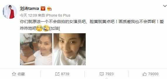 近期,劉濤在微博上面曬出了兩張照片,附文“你們就原諒一個不會自拍的女演員吧、臉黃就黃點吧!畫質(zhì)差我也不會弄??!愛咋咋地吧”!