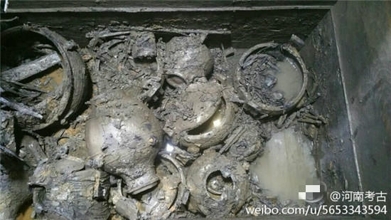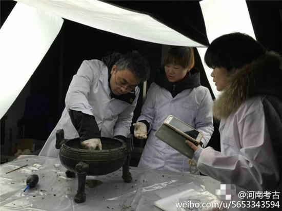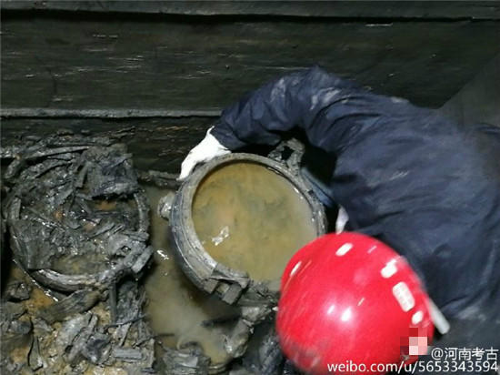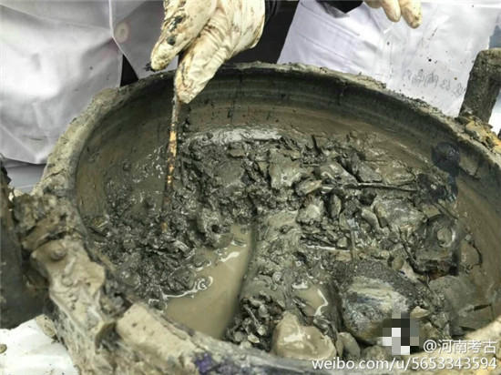 據@河南考古 微博消息,近日在河南一座古墓發(fā)掘現場,出土了幾只裝有“肉湯”大鼎,。