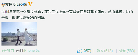 人民網北京7月15日電 古巨基和助理女友陳英雪的20年“地下情”終于傳出喜訊,今日(7月15日),古巨基發(fā)布微博,公布了自己與助理女友的結婚照,并感嘆道:“從94年我第一張唱片開始,在我工作上你一直緊守在照顧我的崗位。然而此后,你的未來,就讓我來好好的照顧。”