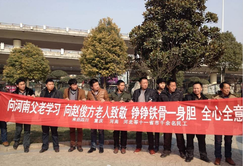 去年11月,濮陽老人趙俊方(2010年“感動中國”候選人)遠(yuǎn)赴山東聊城陽谷,幫13省1000余農(nóng)民工討薪,經(jīng)過近兩個月努力,要回280萬。為表感謝,1月17日,來自6個省份的農(nóng)民工兄弟齊聚鄭州,為老人送來錦旗。