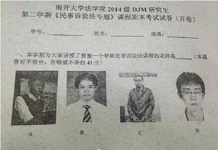 南開大學(xué)法學(xué)院某科目的期末試卷被學(xué)生上傳,瞬間引爆學(xué)生圈。同學(xué)們表示:“內(nèi)傷了”“臉盲怎么辦”“想想真的很有道理啊!”…也有同學(xué)吐槽,“老師您用的是大學(xué)時候的證件照,現(xiàn)在不長這樣了…”這還真是一個刷臉的時代啊