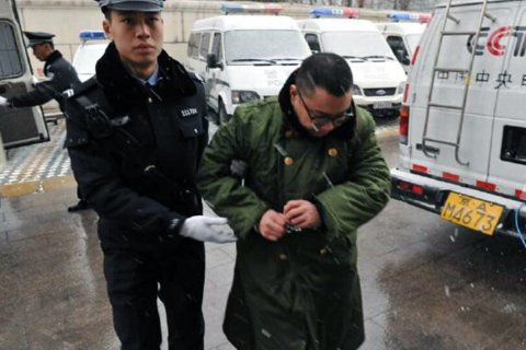 尹相杰頂著雪穿著綠色軍大衣被法警帶進法院,等候?qū)徖?。朝陽法院供圖