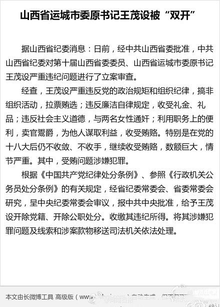 據(jù)中央紀委監(jiān)察部網(wǎng)站消息,日前,經(jīng)中共山西省委批準,中共山西省紀委對第十屆山西省委委員、山西省運城市委原書記王茂設嚴重違紀問題進行了立案審查。詳細審查處理情況見長微博。