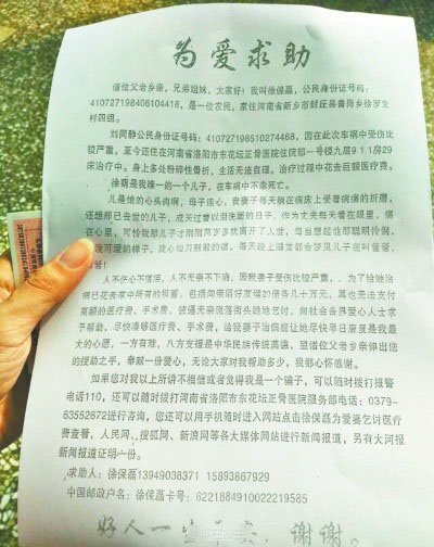 近日,有網(wǎng)友發(fā)微博稱,鄭州火車站候車廳,有個(gè)自稱徐保磊的人向旅客挨個(gè)散發(fā)傳單,稱妻子因出車禍住院無錢治療,向旅客乞討求助。經(jīng)多方調(diào)查:當(dāng)事人已出院兩年多,發(fā)傳單的不是徐保磊本人。大家不要上當(dāng)??!