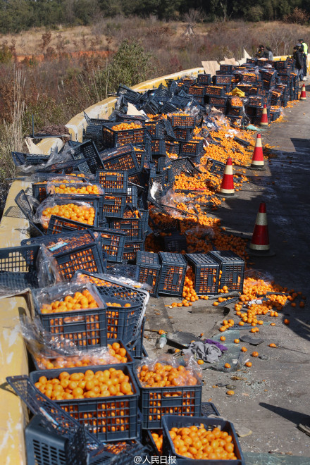 13日凌晨4時許,一輛滿載桔子的大貨車行經昆明市東繞城高速公路時側翻,近30噸桔子灑落一地。數十村民貓著腰來揀桔子,有的拿筐,有的提袋…現場施救人員說,有些開車來搶,往返幾個來回了。駕駛員說,那些桔子破損嚴重,揀回來也不容易。