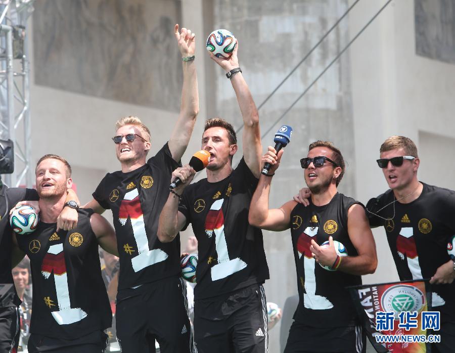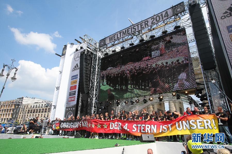 7月15日,德國隊球員參加慶?;顒印.?dāng)日,奪得2014年巴西世界杯冠軍的德國國家隊凱旋歸國。他們前往首都柏林的勃蘭登堡門,與成千上萬的球迷共同慶祝這一歷史性的勝利。7月13日,在巴西里約熱內(nèi)盧馬拉卡納大球場進行的2014年巴西世界杯決賽中,德國隊以1比0戰(zhàn)勝阿根廷隊,歷史上第四次獲得世界杯冠軍。新華社記者張帆攝