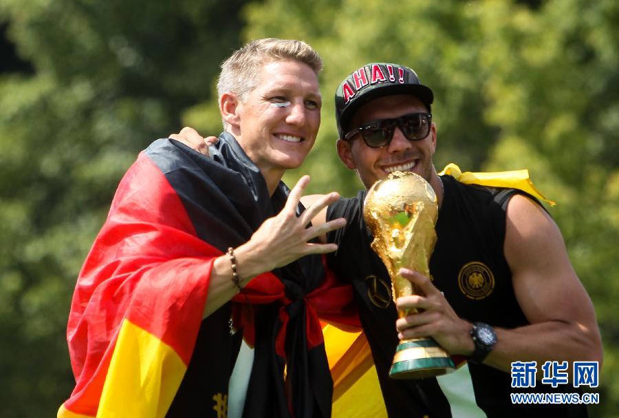7月15日,德國隊球員施魏因施泰格參加慶?;顒?。當(dāng)日,奪得2014年巴西世界杯冠軍的德國國家隊凱旋歸國。他們前往首都柏林的勃蘭登堡門,與成千上萬的球迷共同慶祝這一歷史性的勝利。7月13日,在巴西里約熱內(nèi)盧馬拉卡納大球場進行的2014年巴西世界杯決賽中,德國隊以1比0戰(zhàn)勝阿根廷隊,歷史上第四次獲得世界杯冠軍。新華社記者張帆攝