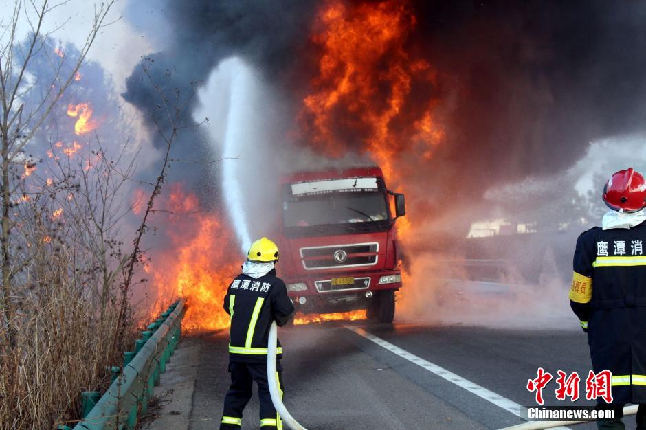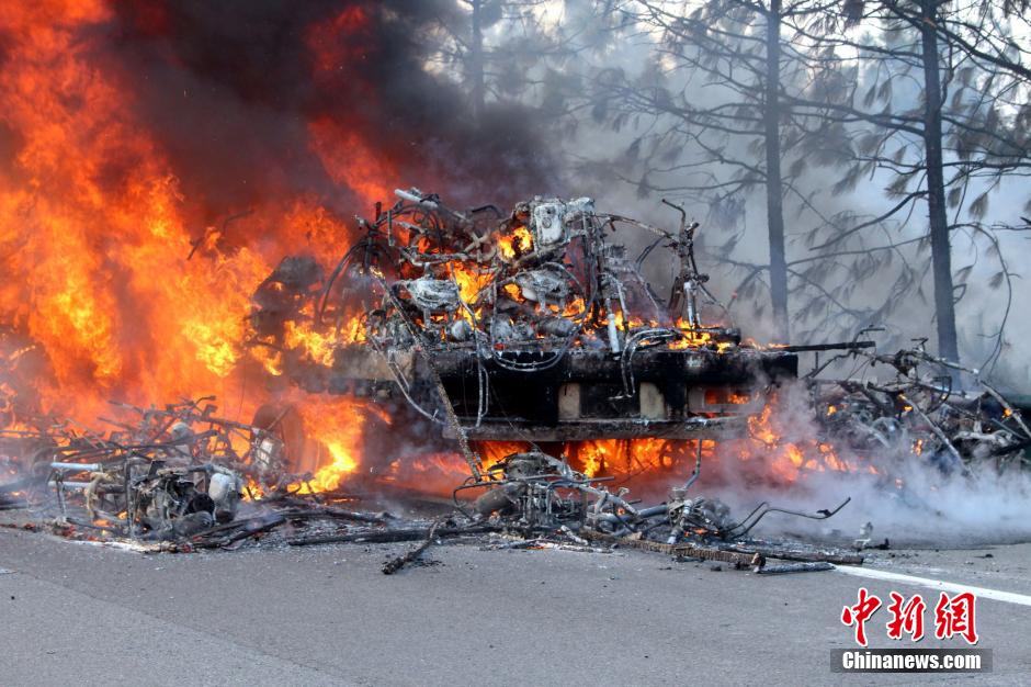 1月23日下午4時許,滬昆高速公路江西弋陽往貴溪方向593公樁(貴溪收費(fèi)站附近)一輛載有133部電動車的半掛車起火,導(dǎo)致電動車被大火“吞噬”。江西貴溪消防官兵接警后迅速到場撲救,半小時后將大火撲滅。據(jù)司機(jī)稱,火災(zāi)疑因高速護(hù)坡雜草叢起火產(chǎn)生的火芯飄至半掛車,引燃包裝電動車的紙殼箱所致。中新社發(fā) 龔武 攝