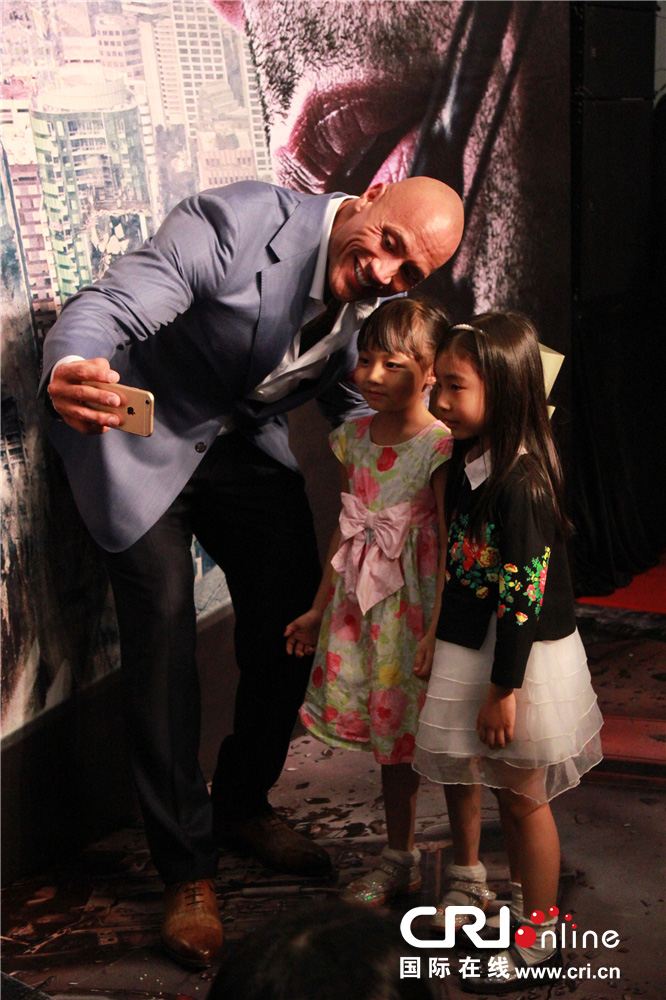 強(qiáng)森與獻(xiàn)花小粉絲賣萌自拍 見面會主創(chuàng)提醒“一定記得喘氣”