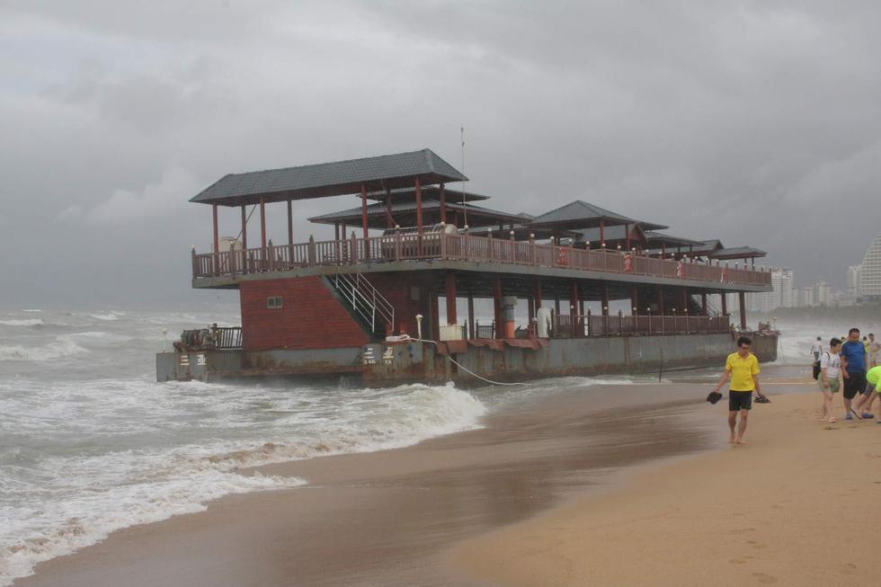 2015年6月23日,海南三亞,“鯨魚”臺風襲擊海南省萬寧市,三亞海面大風大浪,2艘大型貨輪和一艘旅游船,被刮到了三亞灣沙灘上。