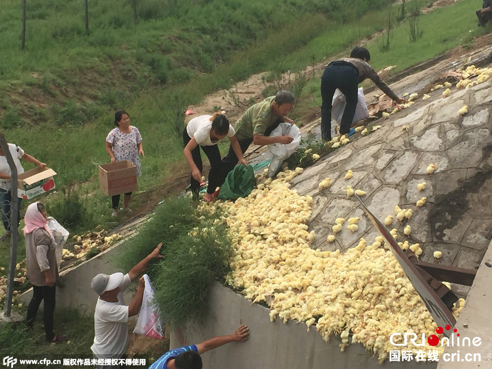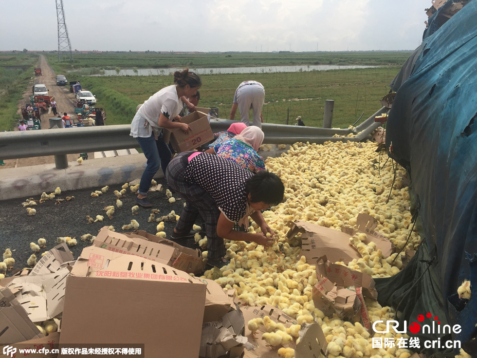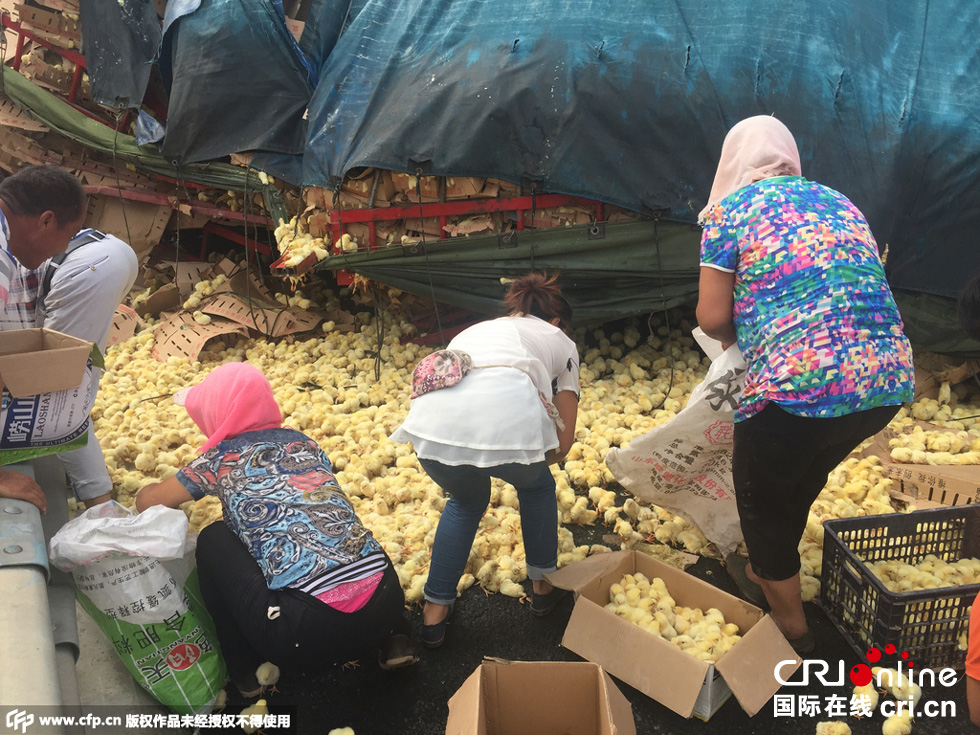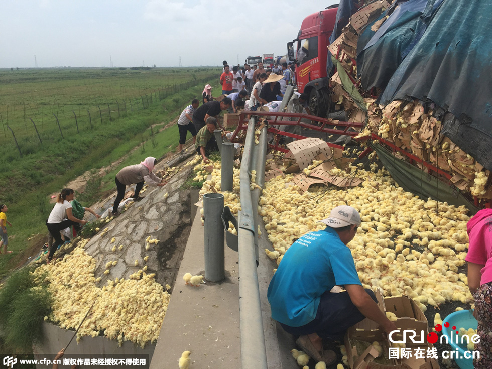 8月25日中午,山東榮烏高速濱州沾化區(qū)段,一輛山東禽類運(yùn)輸車輛傾翻,車上裝有數(shù)萬只小雞。無數(shù)小雞散落在路上和高速護(hù)坡上,死的死傷的傷,大多數(shù)存活。