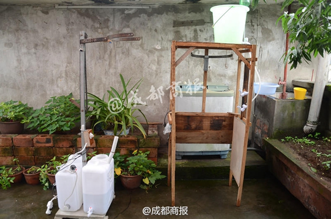 9月16日,四川樂(lè)山,陳攻科的父親正在使用自動(dòng)洗頭機(jī)。38歲的樂(lè)山井研男子陳攻科在16年時(shí)間里,“玩”壞了18個(gè)頭盔,終于發(fā)明出了立式全自動(dòng)按摩洗頭機(jī),并獲得了國(guó)家實(shí)用新型專利。