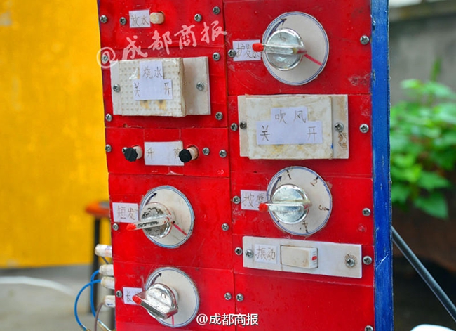 洗頭機(jī)系一個(gè)鐵架子頂部掛著摩托車頭盔,旁邊擺著兩個(gè)塑料水箱,還有一塊控制面板……陳攻科的父親陳述明帶上防水圍脖,坐在椅子上,輕輕按下一個(gè)按鈕,摩托車頭盔自動(dòng)下降罩在他頭上,他再次按下按鈕,摩托車頭盔便在他頭上擺動(dòng)按摩起來(lái)。
