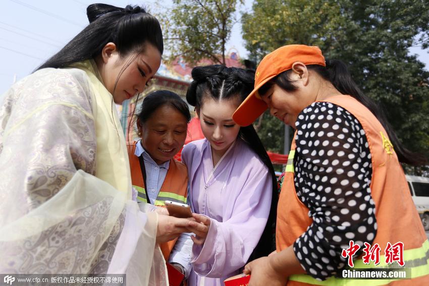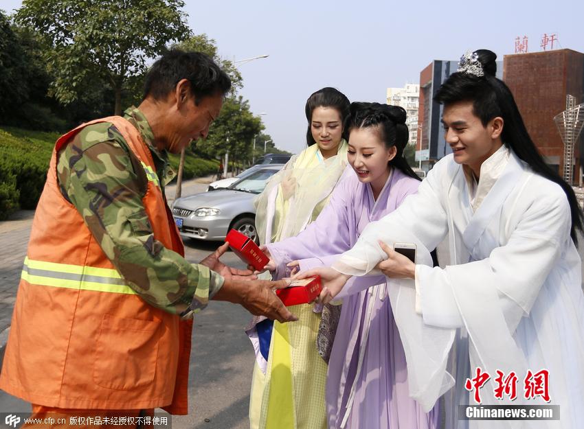 9月23日,河南鄭州古裝愛(ài)好者扮成“花千骨”走上街頭,為環(huán)衛(wèi)工人送月餅迎中秋。盧鍵 攝 圖片來(lái)源:CFP視覺(jué)中國(guó)