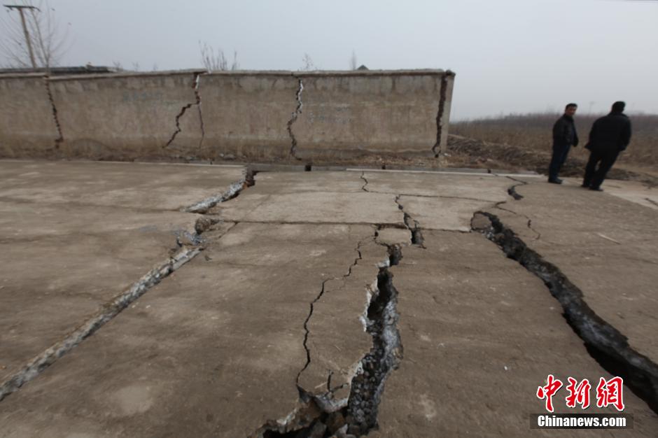 12月25日,山東平邑,位于平邑縣保太鎮(zhèn)的玉榮商貿(mào)有限公司石膏礦發(fā)生坍塌事故。圖為因塌陷開(kāi)裂的道路。視覺(jué)中國(guó)供圖