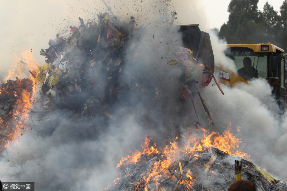 一臺(tái)大型鏟車將陵墓前香爐附近的大量燃燒物推到一處。供圖:視覺中國
