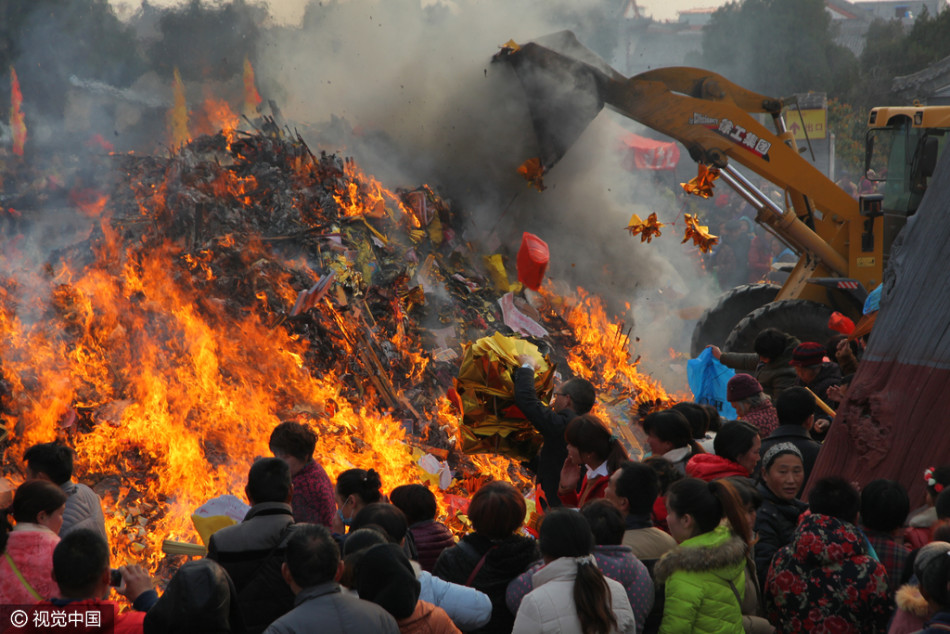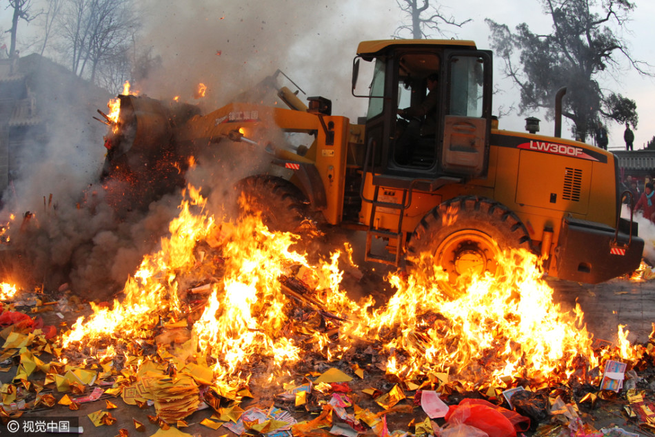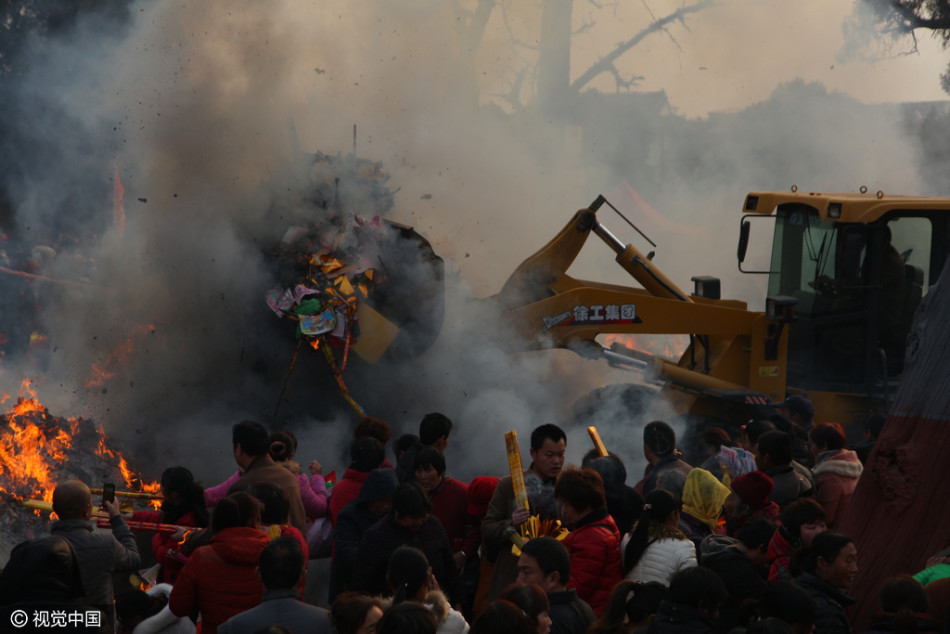 太昊陵廟會(huì)上燒高香的群眾和清理香火的鏟車。供圖:視覺中國