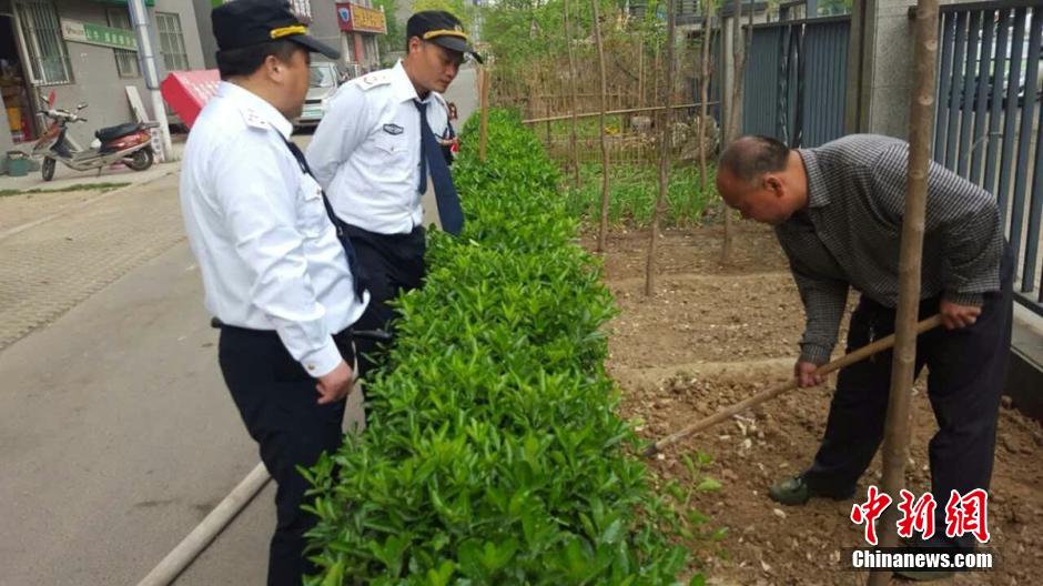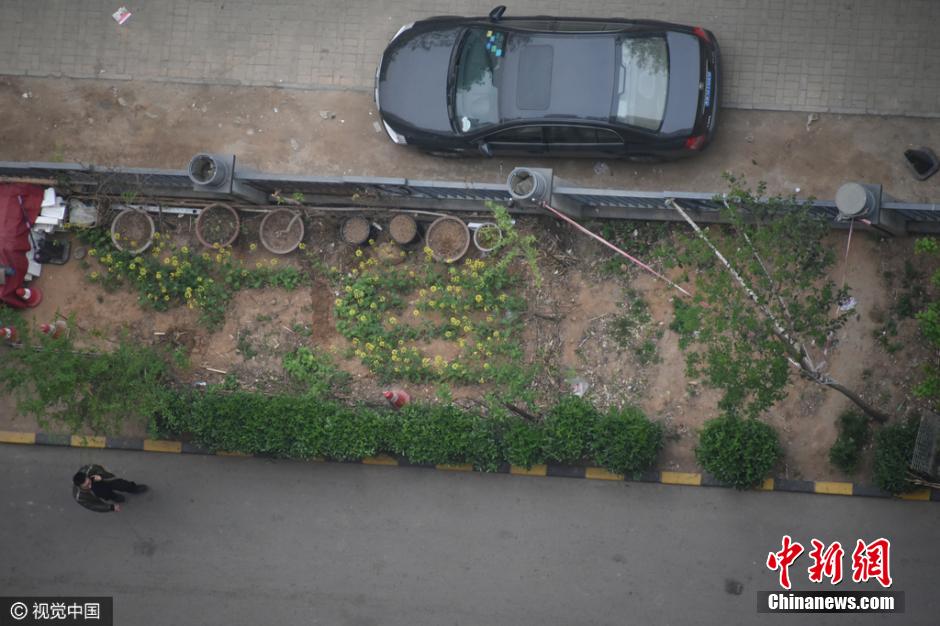 4月5日上午9時(shí)許,未來路街道巡防隊(duì)員司廣紅、盧龍等三人巡邏中發(fā)現(xiàn)一件奇葩事:有一根消防管從燕莊新區(qū)南院9號樓北面的20樓一家住戶窗口被放下,水管的另一頭直通小區(qū)柵欄里的小菜園。鄭州市燕莊村一村民住上了高樓,卻仍然放不下種地種菜。把小區(qū)垃圾清理出來,開墾出一片小菜園,又從20層的高樓往下放水澆菜。這種菜的成本遠(yuǎn)高于買菜,但他卻樂在其中。李四信 攝 圖片來源:視覺中國