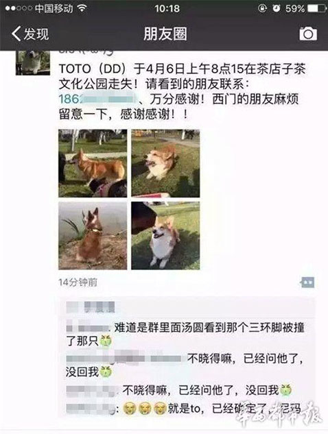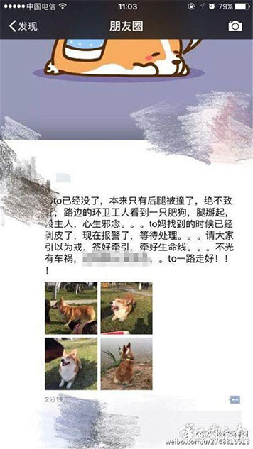 據(jù)主人李女士講述,“早上8點(diǎn)20分左右,我媽媽帶狗出去散步,它跟著別的狗跑丟了。我們找了很久。”李女士說,小狗跑丟后,在成都一愛寵微信群里,有群友稱在三環(huán)路上看到過它,“說是它橫穿三環(huán)路,把后腿撞到了,它就沿著三環(huán)路跑了。”圖為李女士在朋友圈發(fā)布的尋狗信息。