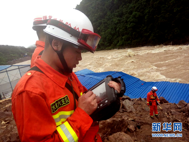 5月8日,在福建泰寧山體滑坡救援現(xiàn)場,武警水電二總隊六支隊官兵利用“雷達生命探測儀”對任務區(qū)進行搜救(手機拍攝)。