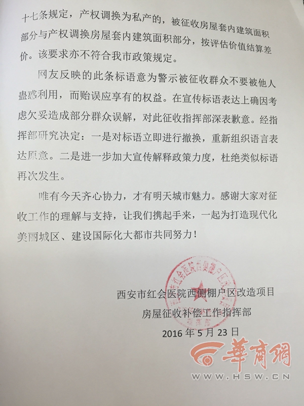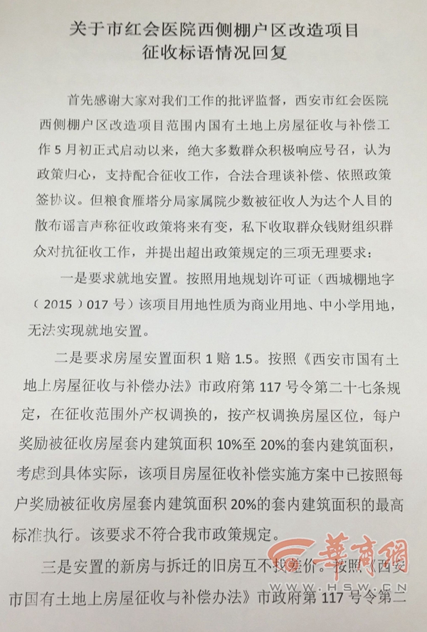 西安市紅會(huì)醫(yī)院西側(cè)棚戶區(qū)改造項(xiàng)目房屋征收補(bǔ)償工作指揮部對(duì)此事的回復(fù)