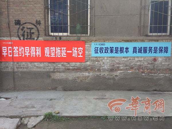 居民樓墻體上貼著拆遷的標(biāo)語