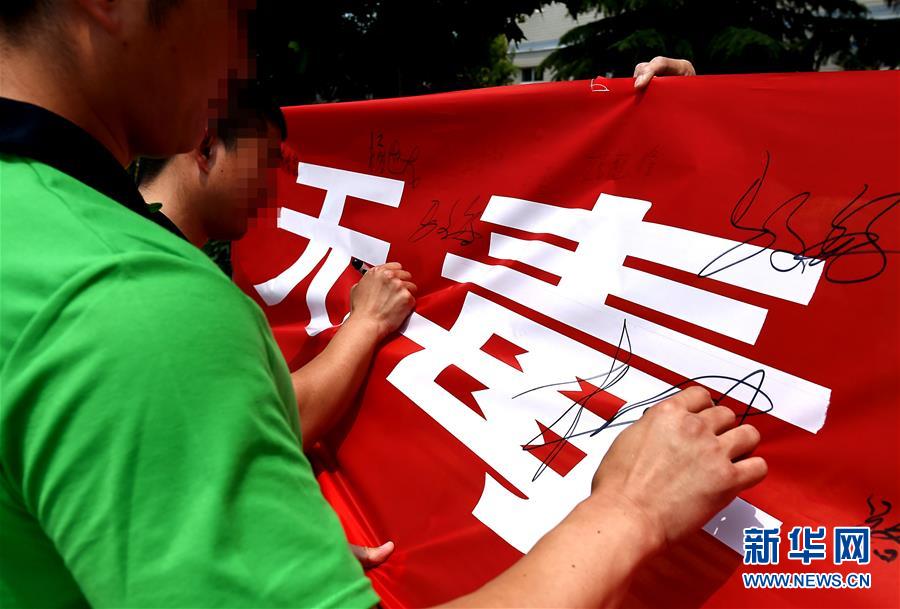 6月22日,河南省未成年人強(qiáng)制隔離戒毒所內(nèi)的戒毒人員在“無毒青春健康生活”條幅上簽名。新華社記者 李安 攝