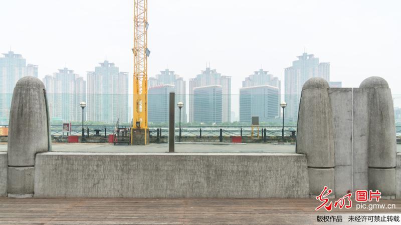 當(dāng)日中午,走訪南外灘老碼頭,見到這一長達數(shù)十米,由鋼筋混凝土墻體和通透式玻璃組合而成的"抗洪神器",其中雙層玻璃防汛墻的厚度達到18毫米,既滿足防汛擋水需要,同時方便游客坐在岸堤邊欣賞老碼頭和江岸景色。(王岡攝/光明圖片)