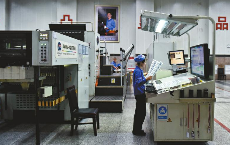 成鈔公司大門口,緊握槍支的武警駐守,在這里,有著嚴密的安檢措施。在經(jīng)過層層申報審批,暫存隨身攜帶的手包和手機后,記者獲批進入生產(chǎn)車間。瞬間,靜謐被機器的轟鳴代替。在車間內(nèi),穿著藍色工裝的工人正有序忙碌著。在這里經(jīng)過多道印鈔工序及干燥、檢驗等環(huán)節(jié)后,一張張雪白的印鈔紙“搖身一變”,成為紅紅綠綠的鈔票,整個過程前后需要耗時1個月左右。