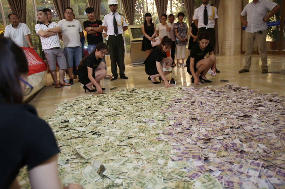 一時間售樓大廳滿地都是錢,美女蹲地查錢,安保站崗,場面壯觀。