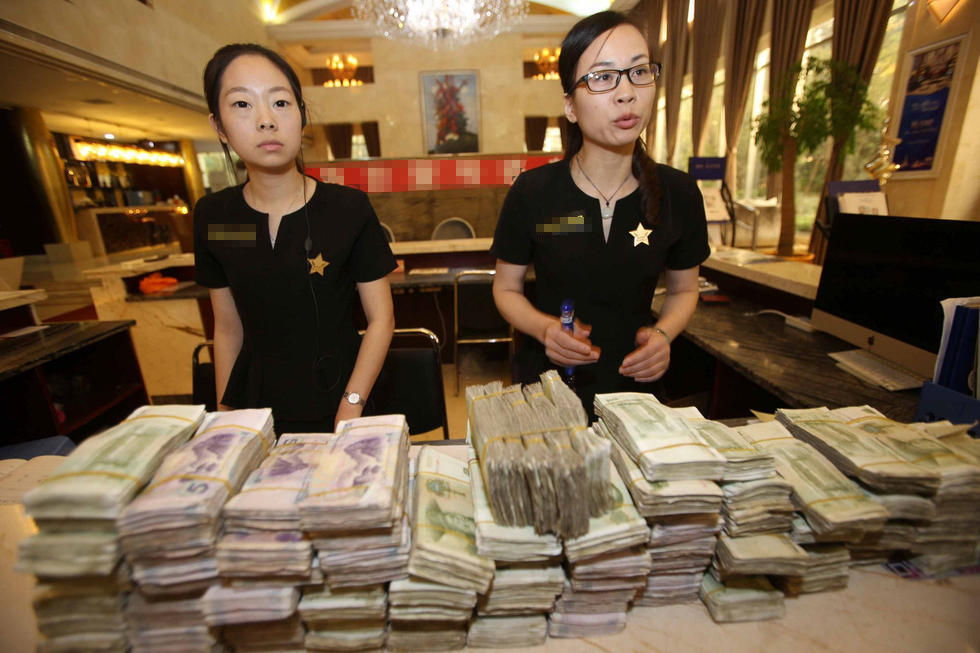 圖為售樓人員數(shù)錢現(xiàn)場。