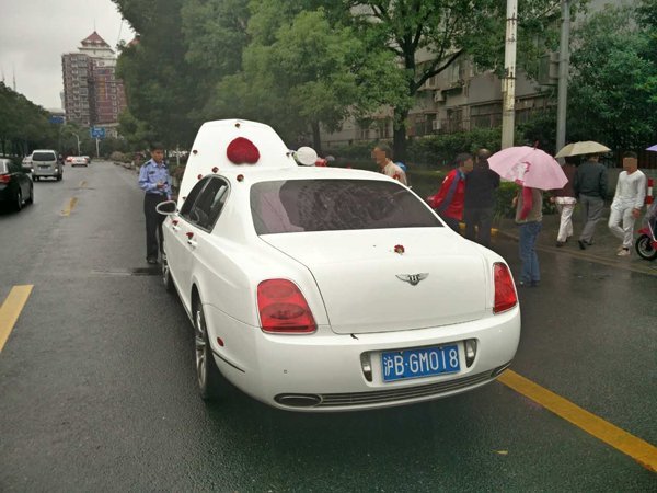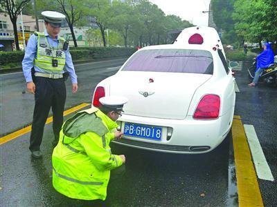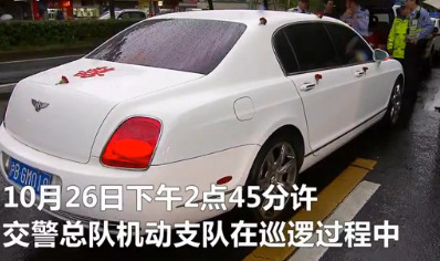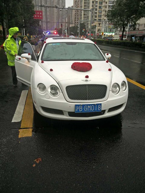 下午2點(diǎn)45分許,上海交警總隊(duì)機(jī)動(dòng)支隊(duì)巡邏時(shí),在周家嘴路近大連路處發(fā)現(xiàn)一路婚車車隊(duì),共計(jì)5輛車,其中領(lǐng)頭的是懸掛“滬BGM018”牌號(hào)的白色賓利歐陸跑車。后經(jīng)查實(shí),此車為套牌車。