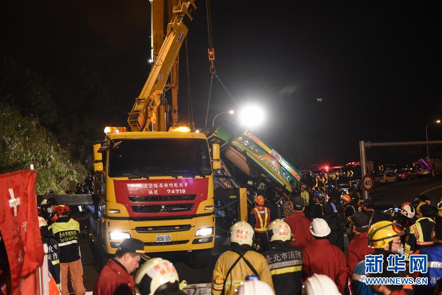 2月14日,事故車輛被吊車吊起。據(jù)臺灣消防部門2月14日零時許發(fā)布的消息,13日晚發(fā)生的翻車事故已造成32人死亡,受傷的12人已全數(shù)送醫(yī)。新華社記者從臺灣公路警察部門獲悉,游覽車上沒有大陸游客。臺北市消防局通報,13日21時6分許,在臺灣公路主干道5號南港系統(tǒng)交流道接3號南下路段,臺北市蝶戀花公司一輛游覽車翻覆于引道邊坡,車內(nèi)共44人(游客42人,導游、司機各1人),其中死亡32人(30人未送醫(yī),2人送醫(yī)后不治),12人送醫(yī)持續(xù)治療中。新華社記者 歐東衢 攝