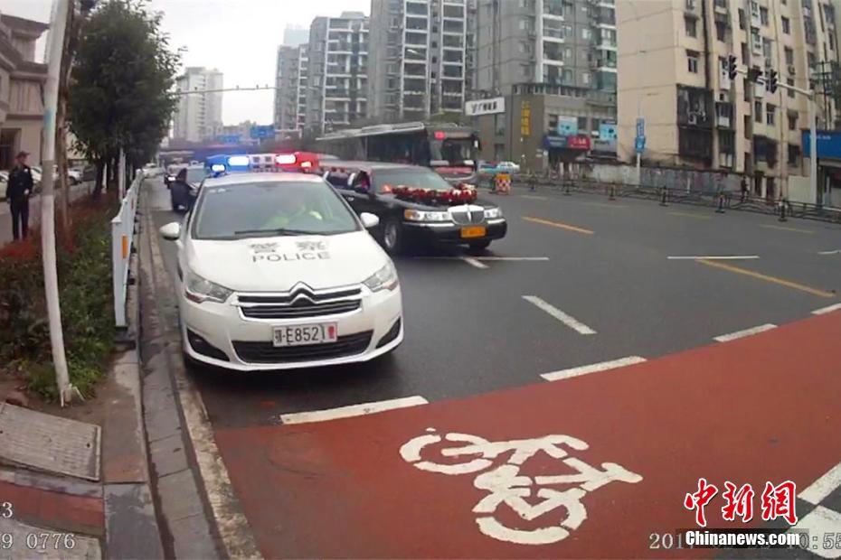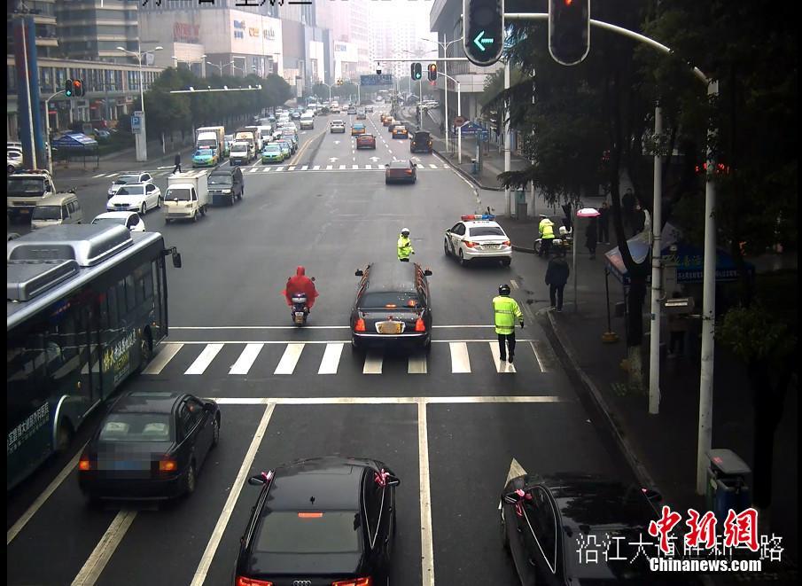 2月22日,湖北宜昌一位新郎在迎親時,迎親車隊的頭車因涉嫌套牌被交警查獲。在新郎家屬和交警溝通后,當(dāng)?shù)亟痪诵曰瘓?zhí)法,先“開道護送”,迎親結(jié)束后才扣下套牌車。圖為警車“護送”新人完成儀式。石寧 攝