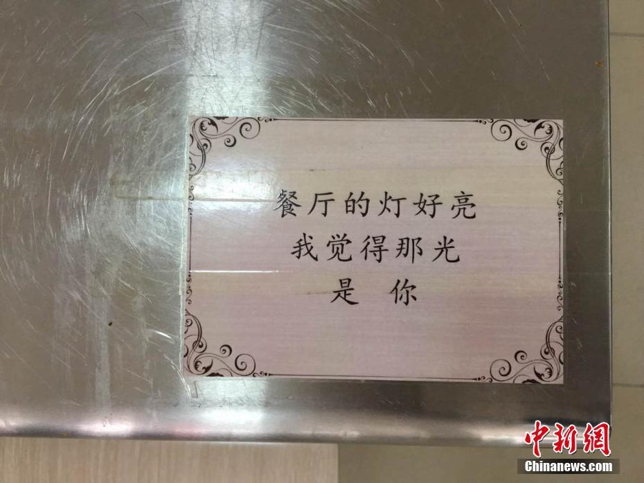 記者16日在西北政法大學(xué)雁塔校區(qū)綜合餐廳里看到,這些富有創(chuàng)意的三行情書貼于餐桌的右下角,語句詼諧幽默,浪漫十足,不時(shí)有買飯路過的學(xué)生駐足觀看,還有人拿出手機(jī)拍照。不少慕名而來的外校生專程前來蹭飯,體會(huì)“樸素的食堂愛情故事”。燕武 阿琳娜 攝影報(bào)道