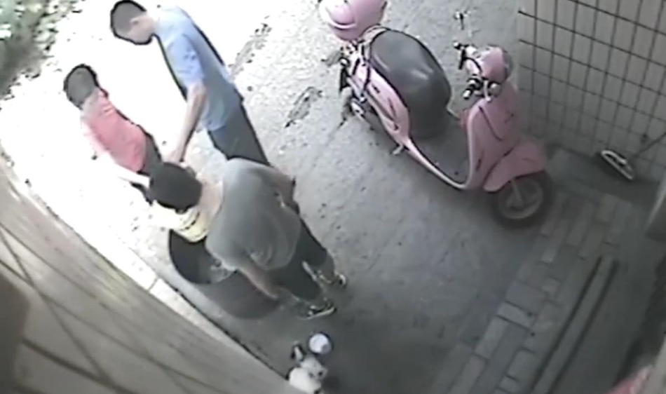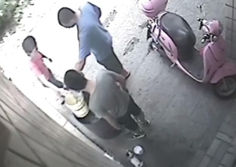 “然后我們以為那個小狗,那個桶那么高,它怎么能跳進去。然后我們就調(diào)監(jiān)控,發(fā)現(xiàn)是鄰居家小孩做的?!眻D為男童抓起小狗將其扔進火盆。