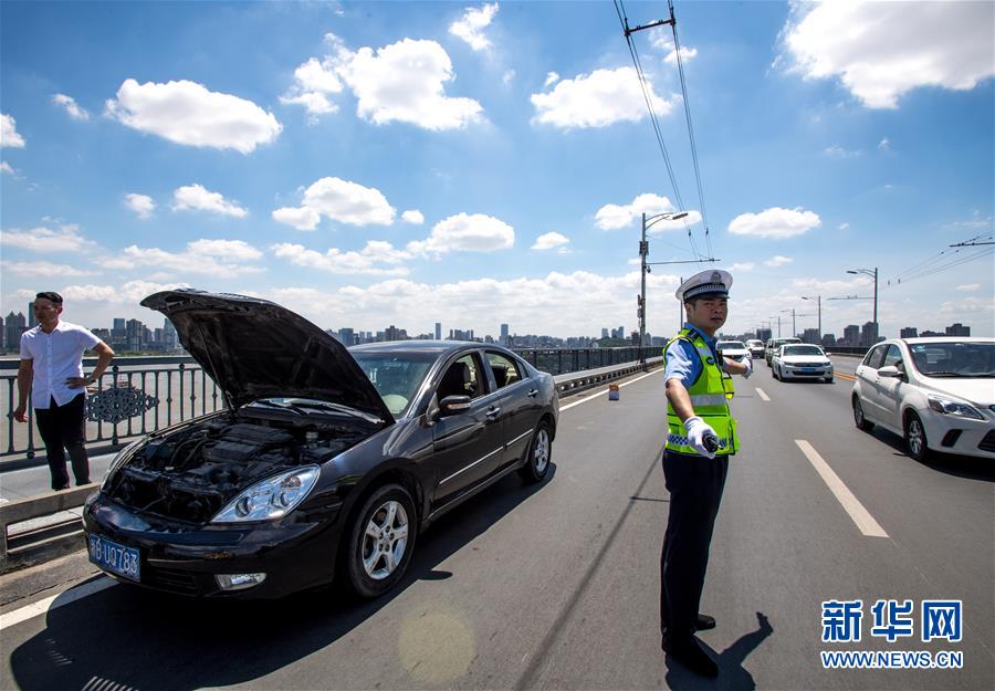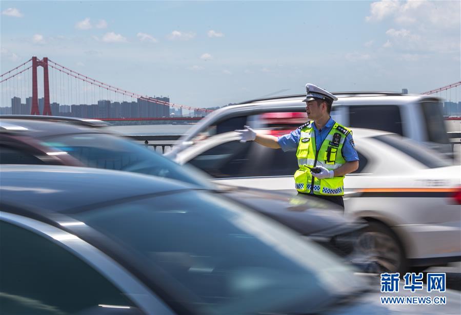 7月19日,武漢大橋大隊交警劉升在橋面上疏導交通。