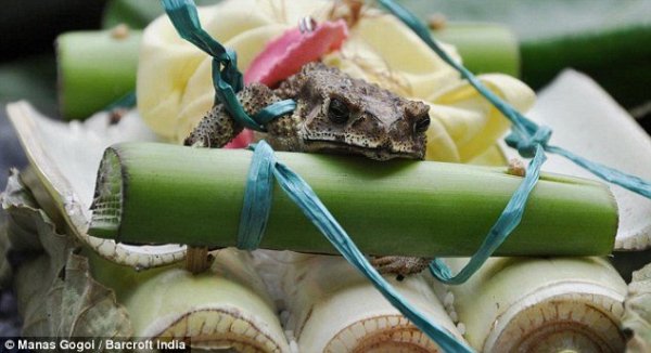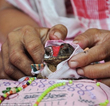 人們從四面八方的村子趕過來參加6月27日舉行的時長6個小時的奇妙的婚禮。達斯介紹有超過1000多人參加了在當?shù)毓珗@舉行的婚禮。兩只青蛙被用傳統(tǒng)顏色盛裝打扮,其中雌性青蛙甚至被村民用金色的鏈子纏裹住。