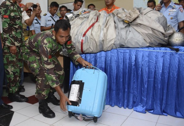 當(dāng)?shù)貢r(shí)間2014年12月30日,印尼龐卡蘭布翁,雅加達(dá)空軍基地指揮官M(fèi)arshal Dwi Putranto正在展示從現(xiàn)場打撈上來的一個(gè)緊急滑梯和乘客的行李箱。