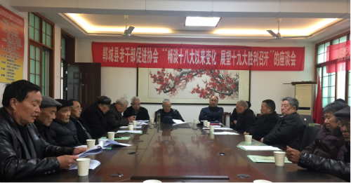 2017年3月24日,鄲城縣老干部促進(jìn)協(xié)會(huì)“暢談十八大以來(lái)變化 展望十九大勝利召開(kāi)”座談會(huì)在鄲城縣老干部活動(dòng)中心成功召開(kāi)。本次會(huì)議由鄲城縣老干部促進(jìn)協(xié)會(huì)秘書(shū)長(zhǎng)吳金德主持,鄲城縣委常委組織部長(zhǎng)侯磊、老干部局長(zhǎng)徐明堂等近50名老干部參與此次座談。會(huì)議一開(kāi)始,老干部促進(jìn)協(xié)會(huì)會(huì)長(zhǎng)趙永祥宣布了領(lǐng)導(dǎo)班子的補(bǔ)充和聘請(qǐng)顧問(wèn)的通知,副會(huì)長(zhǎng)王新民宣讀周口市老干部5號(hào)文件,常務(wù)副會(huì)長(zhǎng)崔允忠做了2016年工作回顧及2017年工作計(jì)劃。