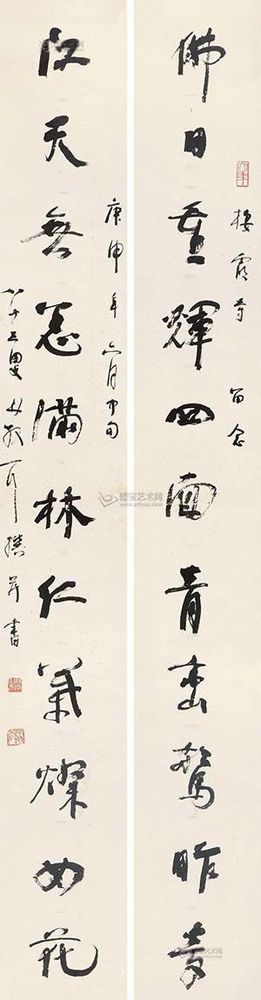 北京匡時(shí)國(guó)際拍賣有限公司描述稱,林散之先生的這副作品作于1980年,為棲霞寺所書,林氏時(shí)年83歲,已是人書俱老的時(shí)期……林散之筆下的線條曲中有直,直中寓曲,剛中有柔,柔中寓剛,從而達(dá)到一種清逸虛妙之境。林散之的草書風(fēng)格雖然欹正相生,但往往會(huì)把其中的變化復(fù)歸平正,偏能得中,奇而能穩(wěn),故顯得格外的老成與持重。由于林散之的藝術(shù)思想受佛家影響較深,而此為“三論宗”的發(fā)源地棲霞寺所書,更能見(jiàn)其書寫之虔誠(chéng)。