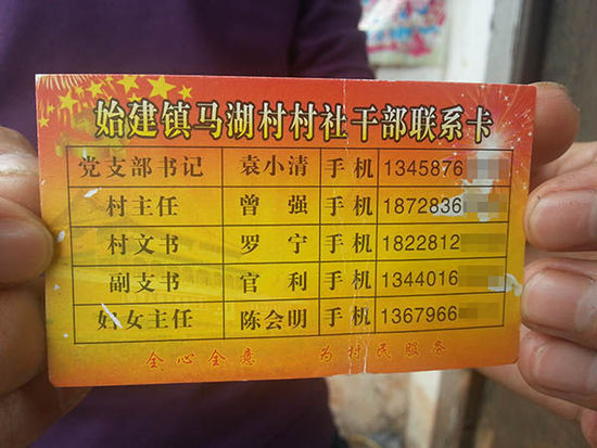 為方便聯(lián)系,村支書(shū)發(fā)放給村民們的聯(lián)系卡。