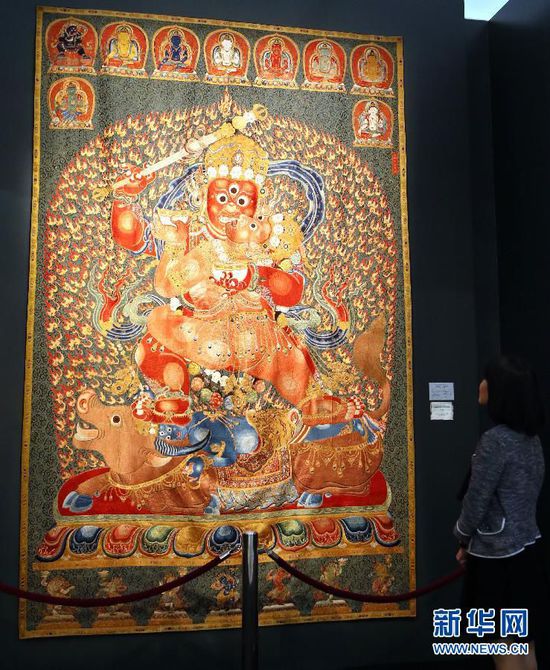 一位觀眾在香港佳士得2014年秋季拍賣會預(yù)展上觀看明永樂御制紅閻摩敵刺繡唐卡(11月21日攝)。新華社記者李鵬攝