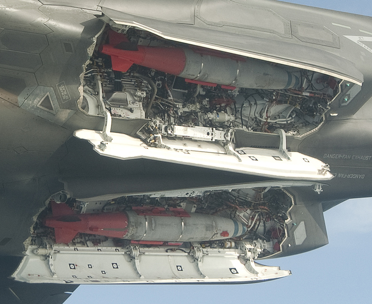 3月2日,美國洛-馬公司生產的F-35B BF-03試驗機加掛兩枚JDAM制導炸彈升空試飛。試飛過程中,F(xiàn)-35B開啟隱藏式彈艙玩起橫滾機動。圖為-35B BF-03隱藏式彈艙細節(jié)。