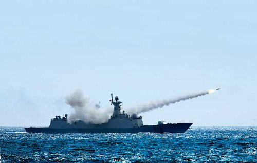 “紅方”護衛(wèi)艦發(fā)射艦艦導彈(解放軍畫報圖片)